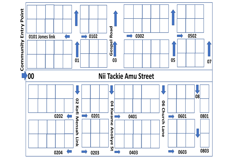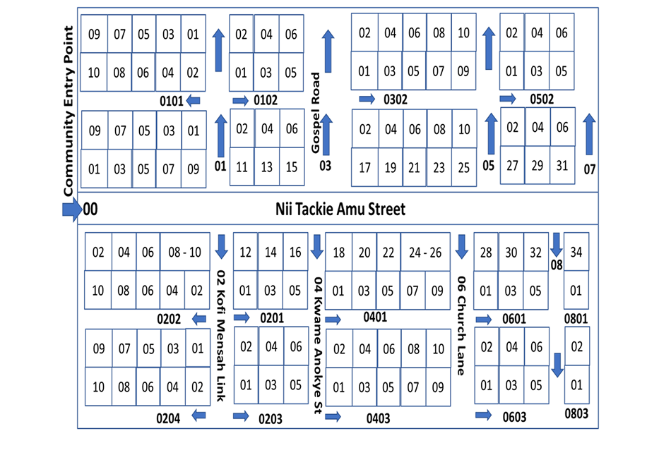The OSL innovative community internal address system is designed appropriately for the haphazard unique layout mix of the Ghanaian structural environment. The internal address system consist of unique numbering patterns of streets and houses in communities with formal and informal layouts as shown below;