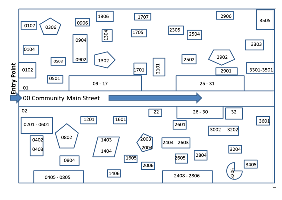 - 2. All houses/structures alongside the community main street are assigned a 2-digit code.